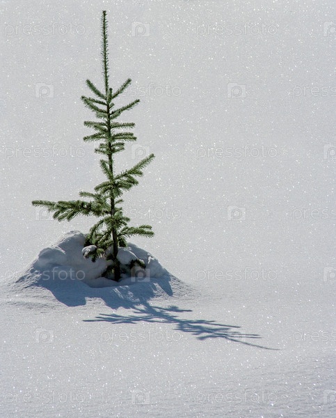 Маленькая елочка в сугробе на фоне искрящегося снега. новогоднее настроение, вертикальный кадр