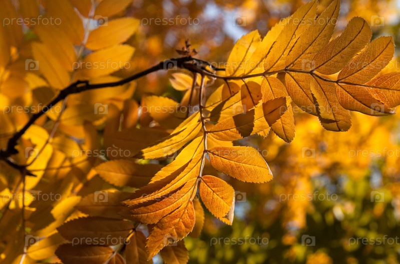 Осень. Желтые и оранжевые листья рябины в солнечных лучах