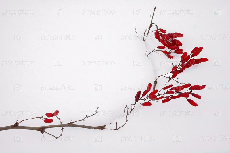 Ветка с красными ягодами барбариса на снегу