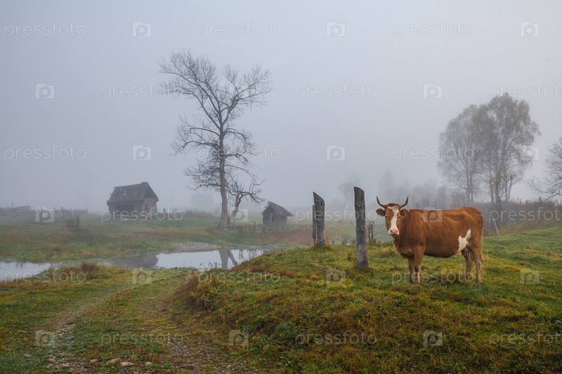 Алтай, сельский пейзаж с туманом и коровой. Деревня горного алтая