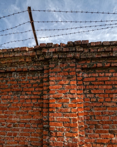Кирпичная стена с колючей проволокой, охраняемая зона