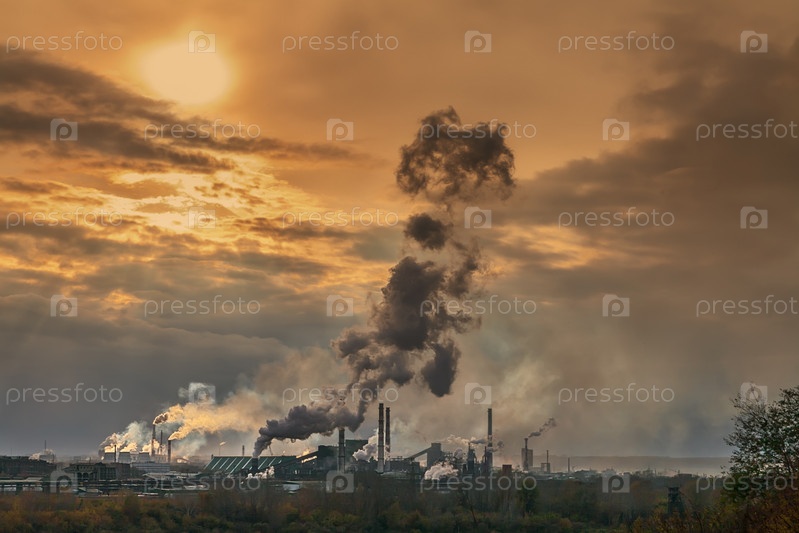 Кузбасс, заводской пейзаж. Трубы большого завода и дым в небе