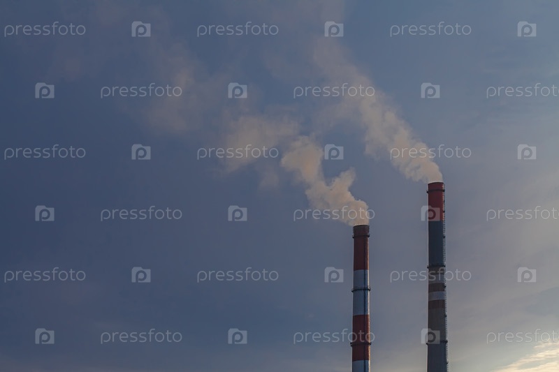 Экология и загрязнение воздуха. Трубы большого завода и дым в небе. ТЭЦ