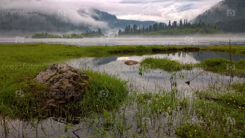 Горный Алтай, озеро Телецкое. Вид на озеро в тумане раннего утра