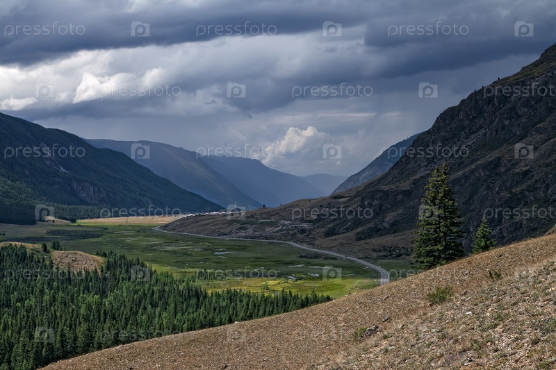 Алтай, долина Улаганский район, поселок Акташ. Грозовое небо в горном алтае. Вид на Чуйский тракт сверху.