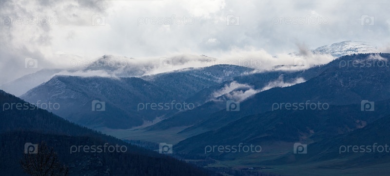 Алтай, вид с перевала Чике Таман на горные вершины в тумане. Вечер в горах. Горный Алтай весной.