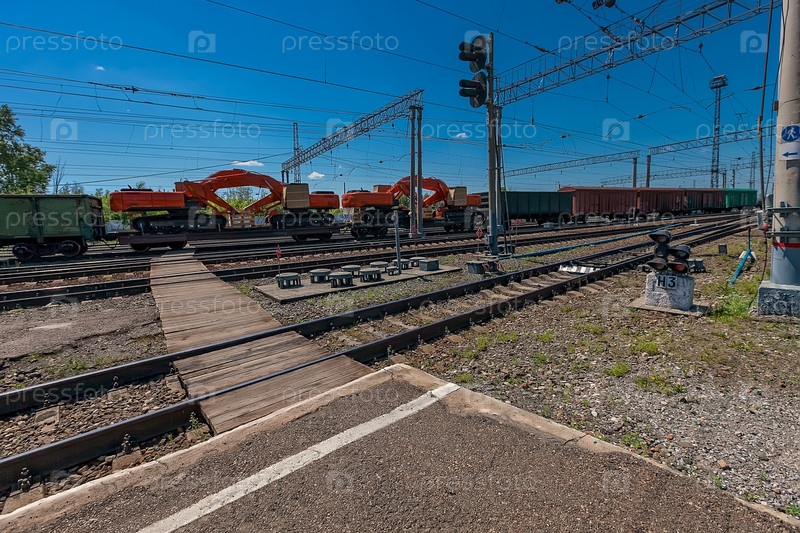 Кузбасс, Станция Тайга. грузовой состав поезда с техникой. Железнодорожные пути.
