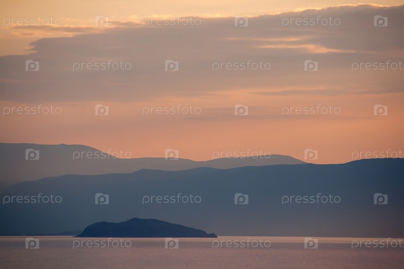 Озеро Байкал, закат над проливом Малое море. Острова Байкала