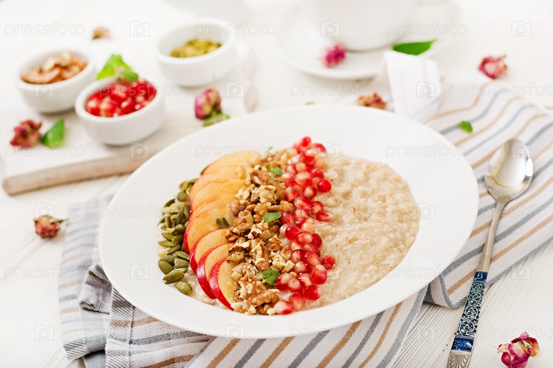 Вкусная и здоровая овсяная каша с яблоками, гранатом и орехами