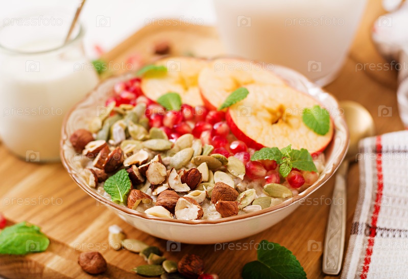 Вкусная и здоровая овсяная каша с яблоками, гранатом и орехами