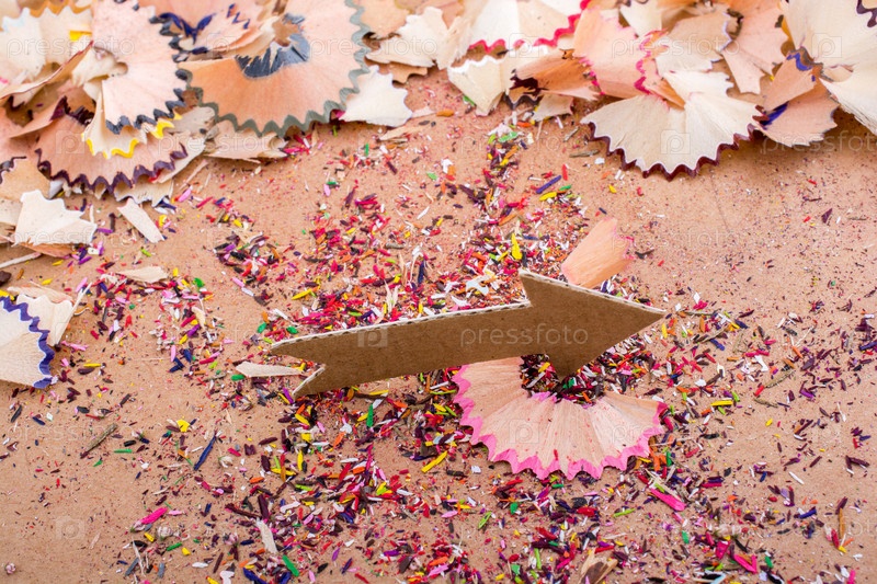 Стрелка из бумаги на фоне карандашных стружек