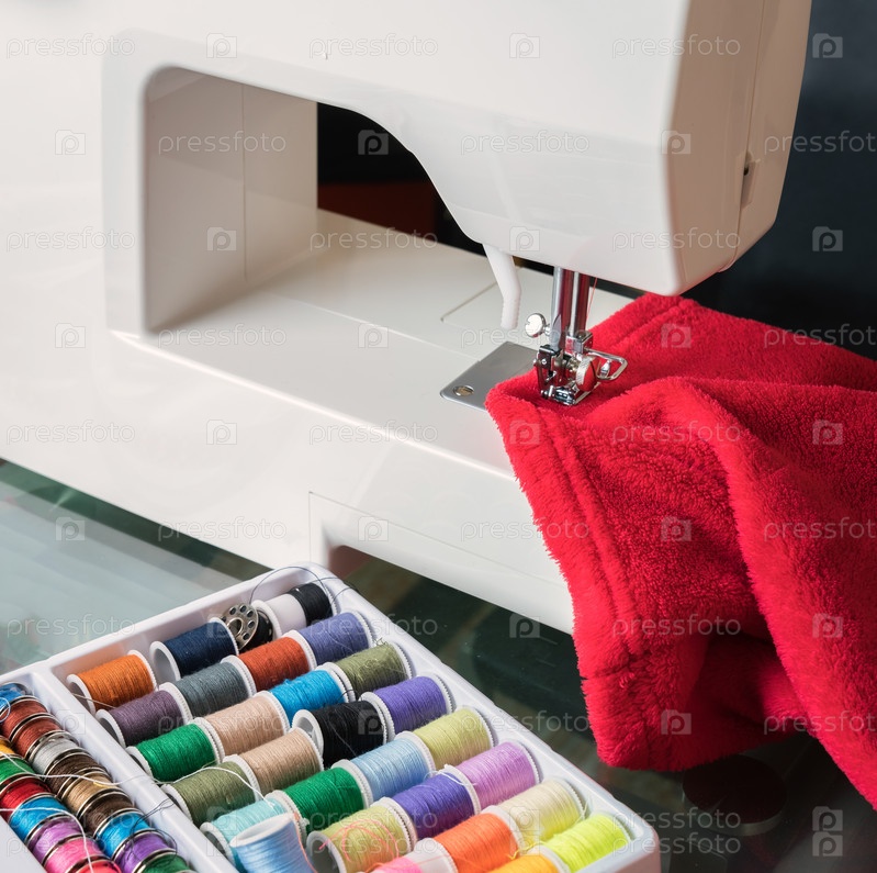 Белая швейная машина и красная ткань