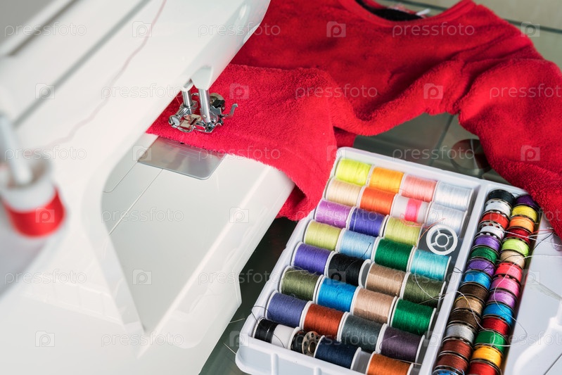 Швейная машина, красная ткань и швейные принадлежности