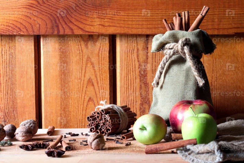 Яблоки и палочка корицы на деревянном фоне