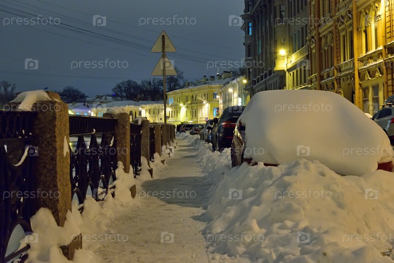 Покрытые снегом автомобили на набережной реки Мойки в ночное время