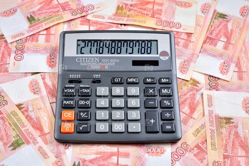 Черный калькулятор на российских банкнотах пять тысяч рублей