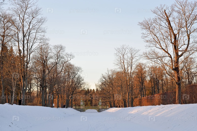 Мост с башенками в Александровском парке в зимний период. Пушкин, Царское Село, Санкт-Петербург