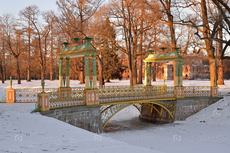Мост с башенками в Александровском парке в зимний период. Пушкин, Царское Село, Санкт-Петербург