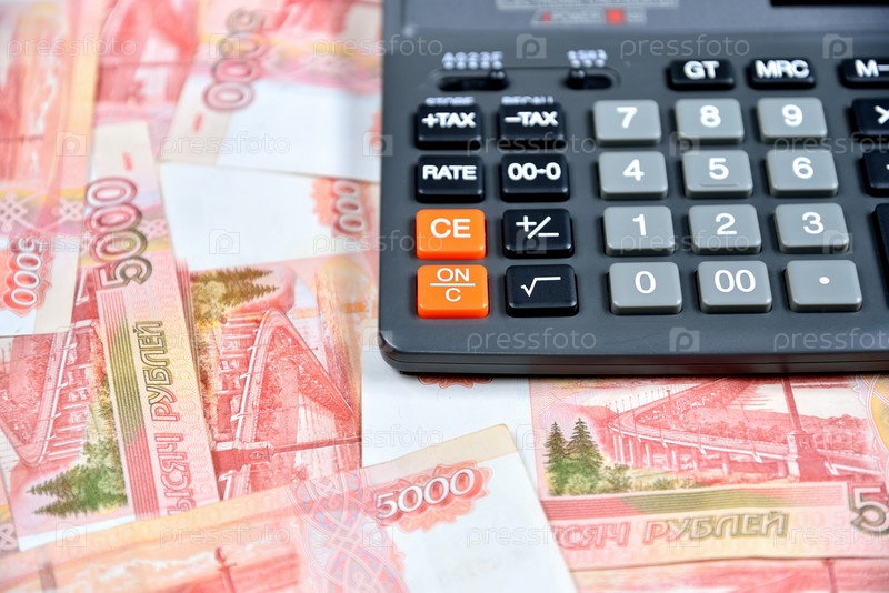 Калькулятор лежит на российских пятитысячных банкнотах