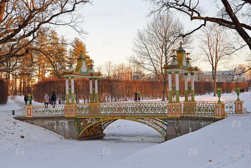 Мост с башенками в Александровском парке в зимний период. Пушкин, Царское Село, Санкт-Петербург