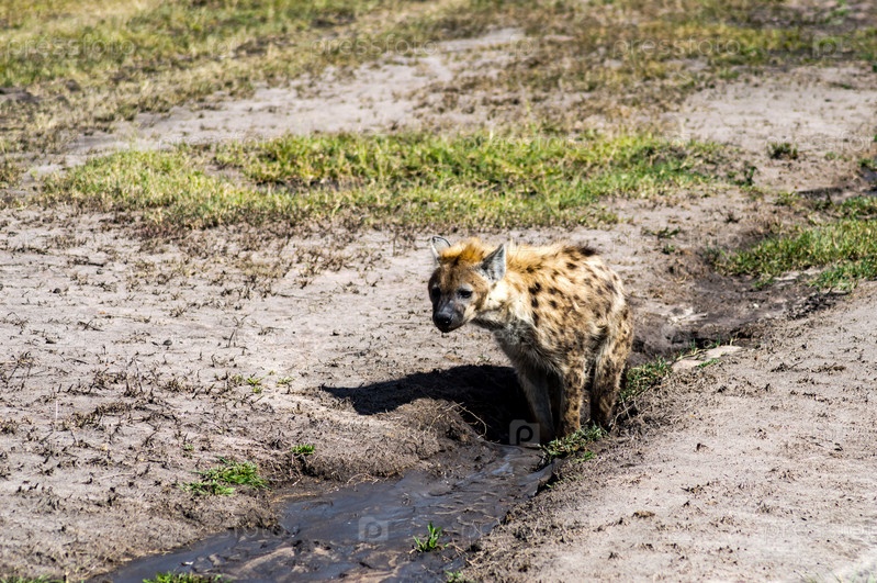 Гиена, принимая грязевые ванны в Масаи Мара парке на северо-западе Кении