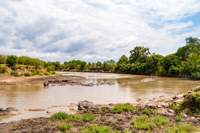 Стада бегемотов в реке Мара в Масаи Мара парке на северо-западе Кении