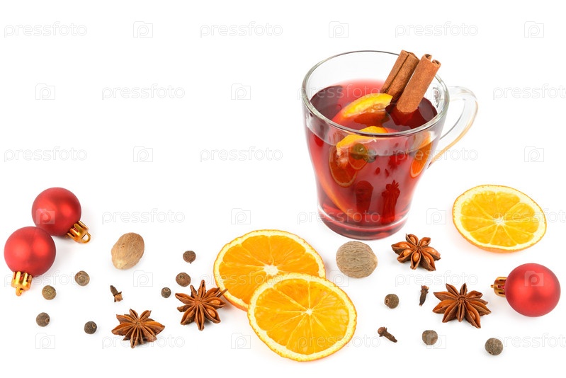 Горячий глинтвейн на белом фоне с рождественские специями