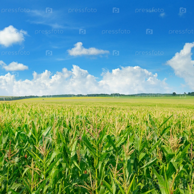 Зеленое поле кукурузы и голубое небо