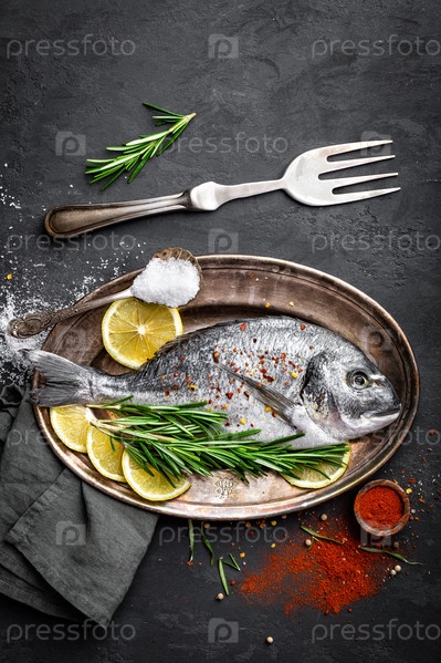 Свежая сырая рыба дорадо с ингредиентами для приготовления