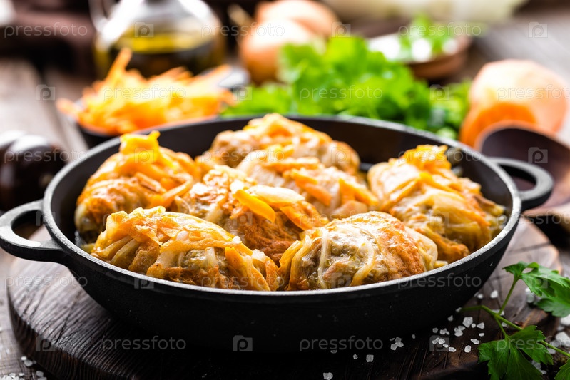 Голубцы тушенные с мясом и овощами в кастрюле на темном деревянном фоне