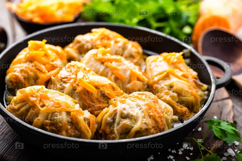 Голубцы тушенные с мясом и овощами в кастрюле на темном деревянном фоне