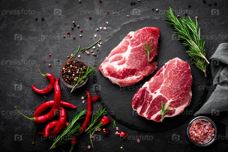 Свежие стейки на грифельной доске на черном фоне. Вид сверху