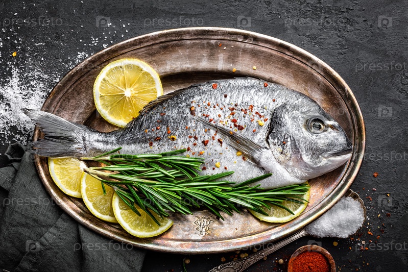 Свежая сырая рыба дорадо с ингредиентами для приготовления