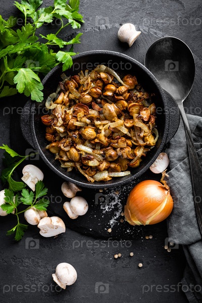 Грибы жареные с луком, вид сверху