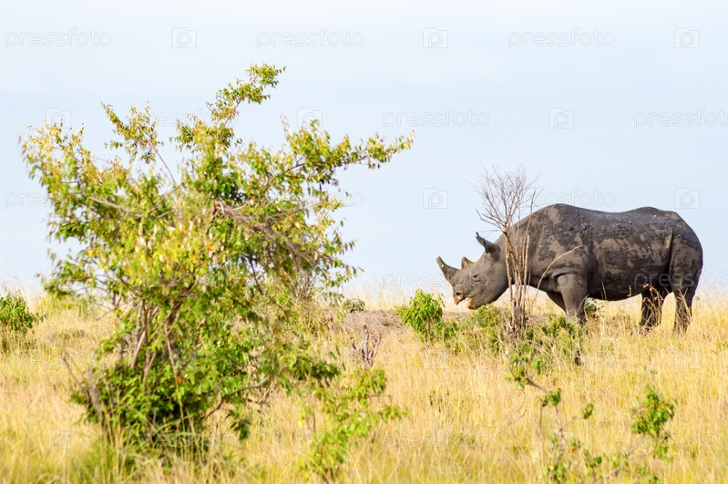 Одинокий носорог в саванне Масаи Мара парке в северной части Кении