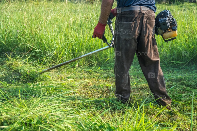 Садовник косит травы газонокосилкой