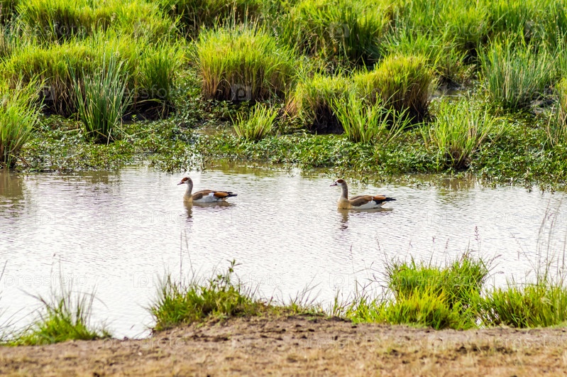 Египетский гусь на озере в саванне Масаи Мара парка в Северной Кении