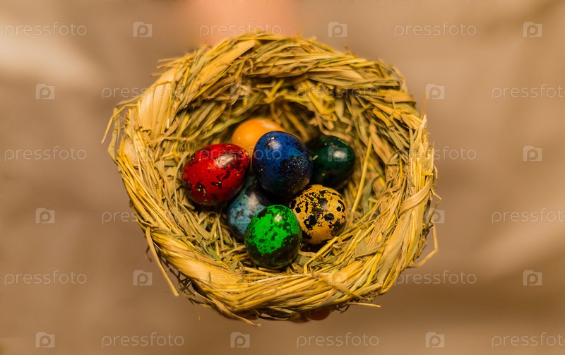 Маленькие разноцветные перепелиные яйца в гнезде