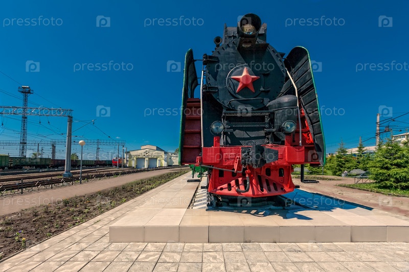 Кузбасс. город Тайга, вокзал. Памятник железной дороге. Локомотив памятник и голубое небо