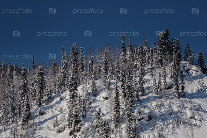 Кузбасс, Горная Шория зимой. Снежные заносы в зимнем лесу. Вершина горы с хвойными деревьями в снегу