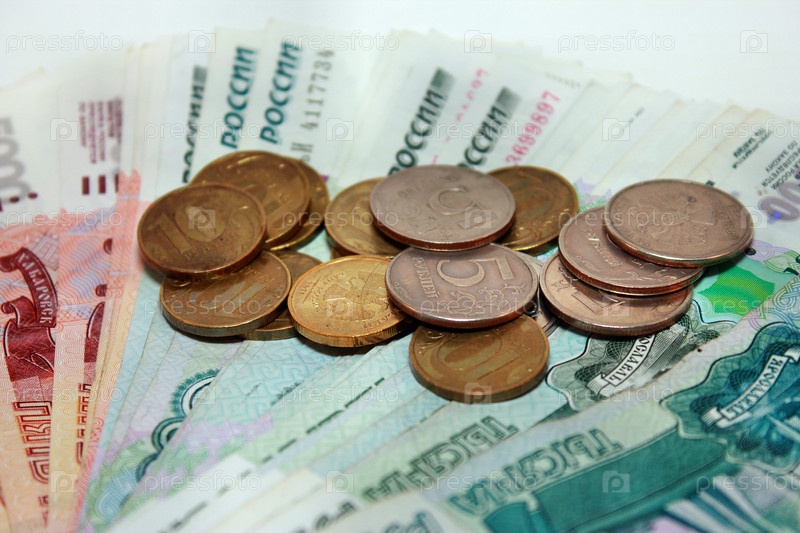 Купюры номиналом тысяча и пять тысяч рублей и мелочь