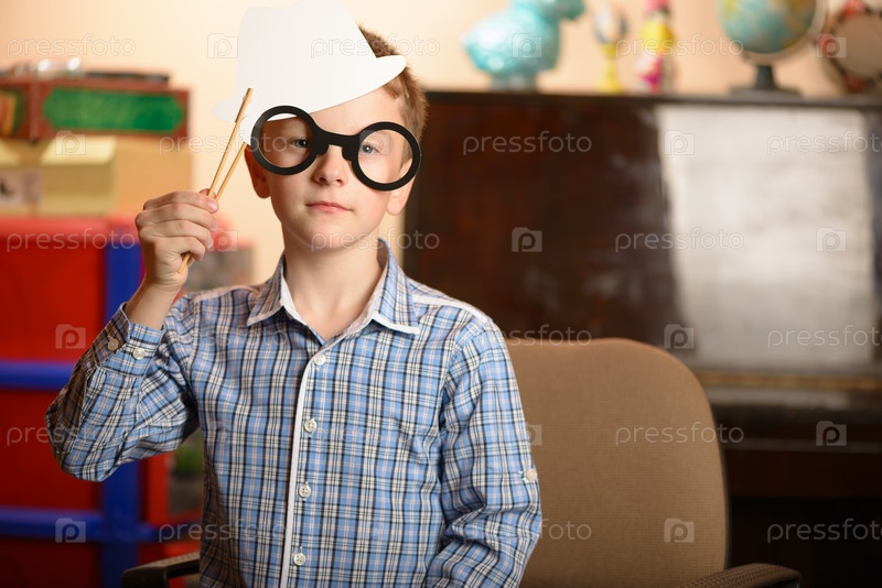 Портрет ребенка с бумажными очками и шляпой