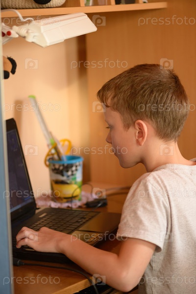 Мальчик печатает на клавиатуре