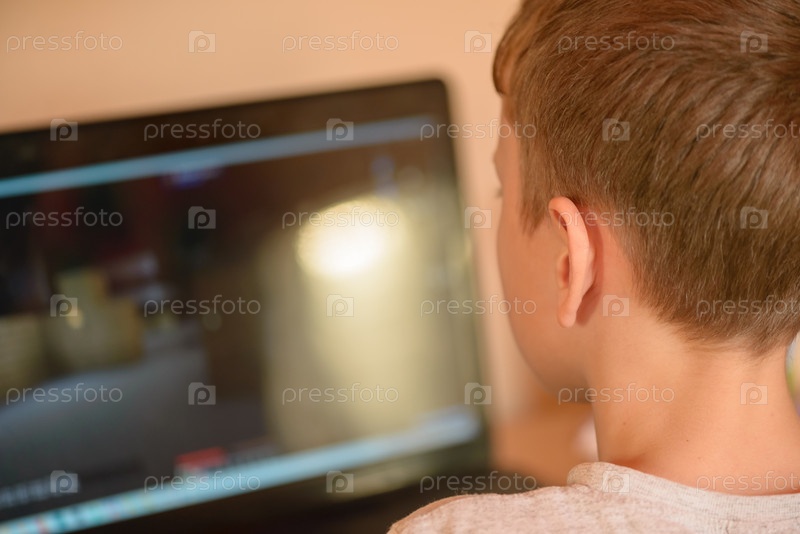 Мальчик печатает на клавиатуре компьютера в своей комнате