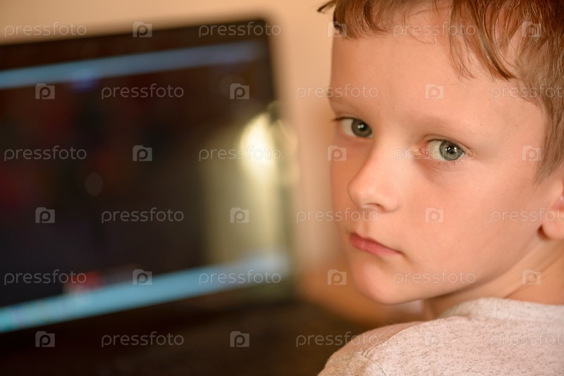 Мальчик печатает на клавиатуре компьютера в своей комнате