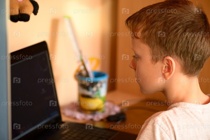 Мальчик печатает на клавиатуре компьютера в своей комнате