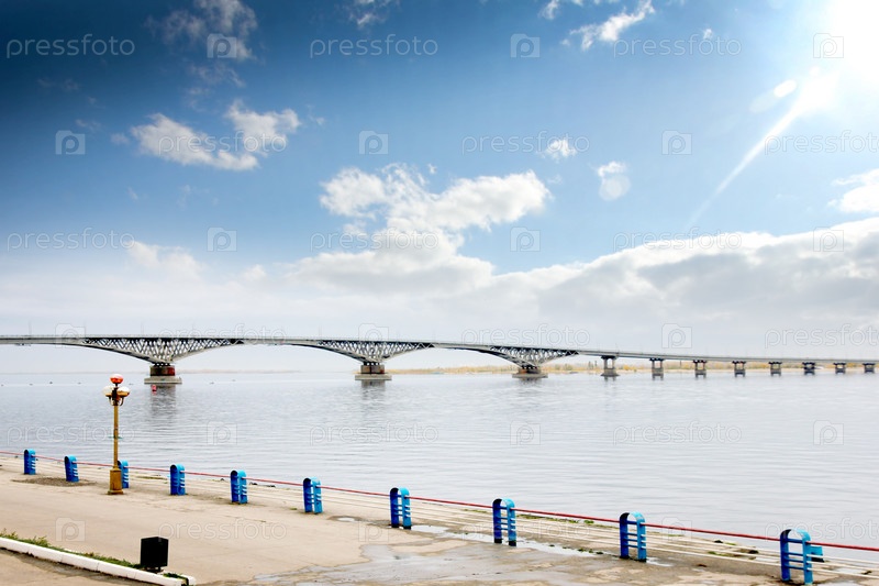 Открытый мост на реке и сияющее небо