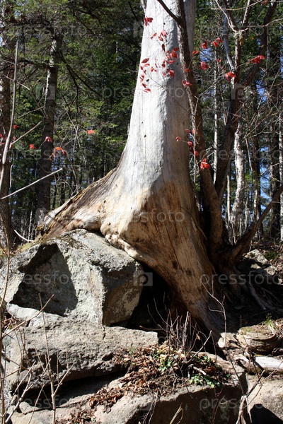 Хвойный лес с большим деревом на огромных камнях