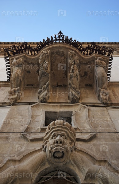 Италия, Сицилия, Шикли (провинция Рагузы), украшения на фасаде барочного дворца Беневентано на закате