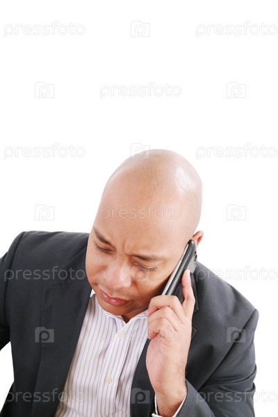 Портрет серьезного бизнесмена, говорящего по мобильному телефону на белом фоне